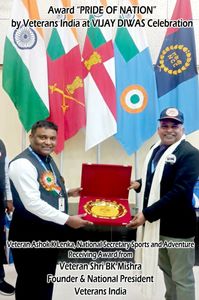 "Pride of Nation" Award presnted by Mr Binay K Mishra, Founder and National President, Veterans India on 15 Dec 2019 at Vijjay Diwas at DG NCC Auditorium Delhi Cantt