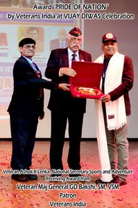 "Pride of Nation" Award from Maj Gen GD Bakshi, PVSM, SM Patron Veterans India conferred On occassion of Vijay Diwas by Veterans India at DG NCC Auditorium, New Delhi on 15 Dec 2019